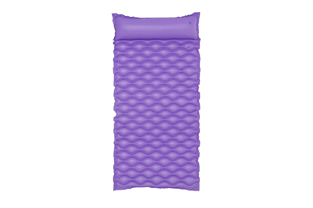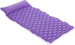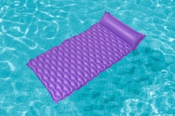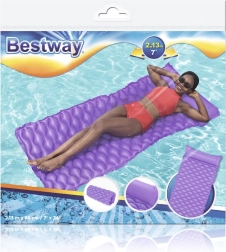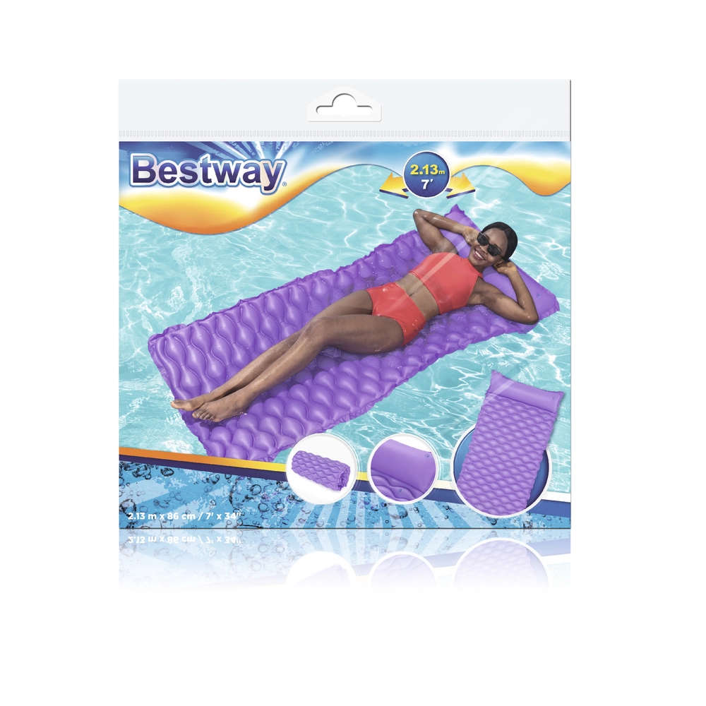 Plavajoča blazina Bestway izstopa po udobni obliki z vgrajenim vzglavnikom, ki podpira glavo in vrat. Valovita površina povečuje udobje pri ležanju, medtem ko trpežen PVC zagotavlja dolgo življenjsko dobo in odpornost na manjše poškodbe.