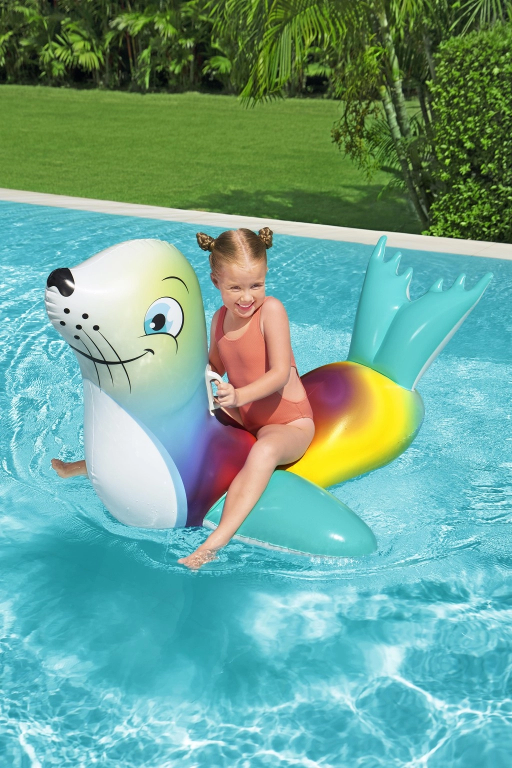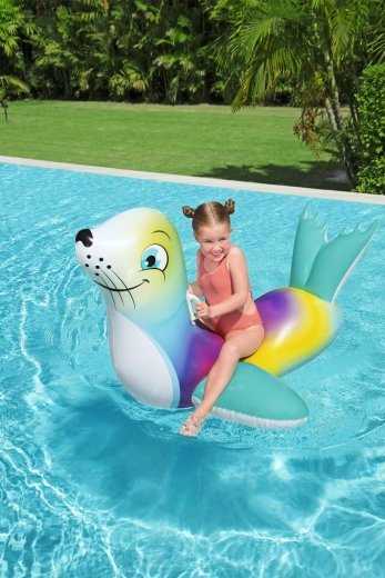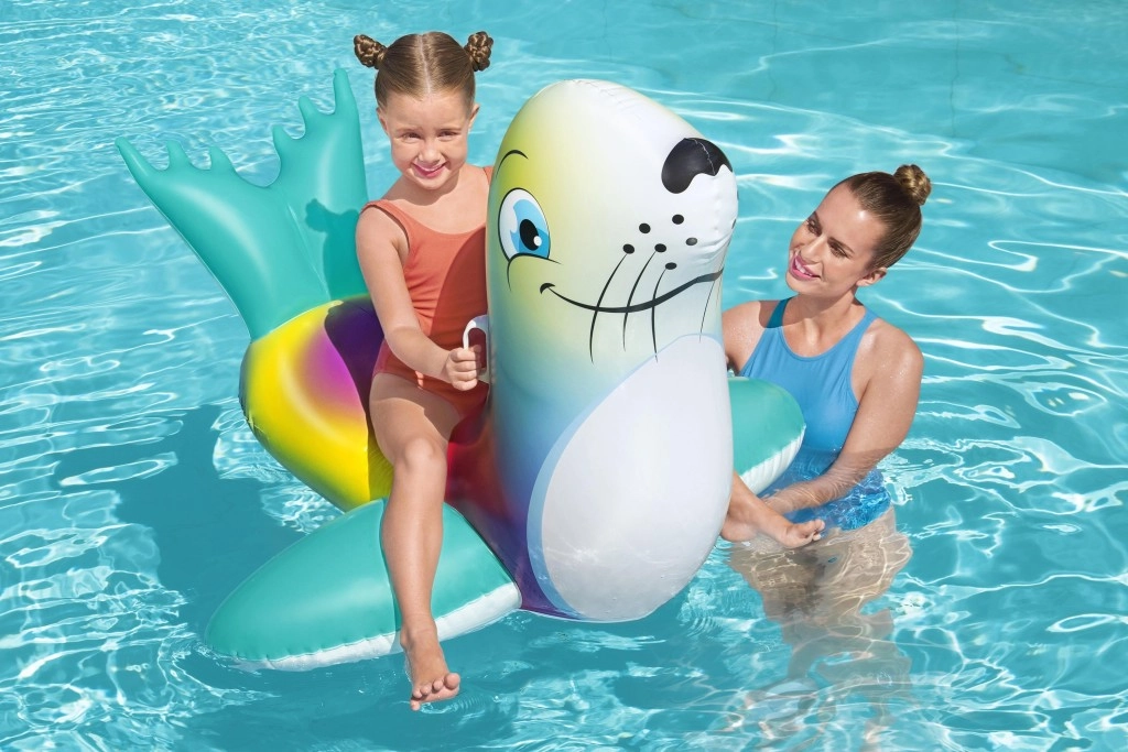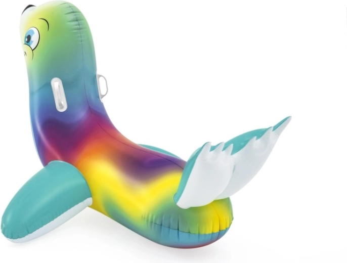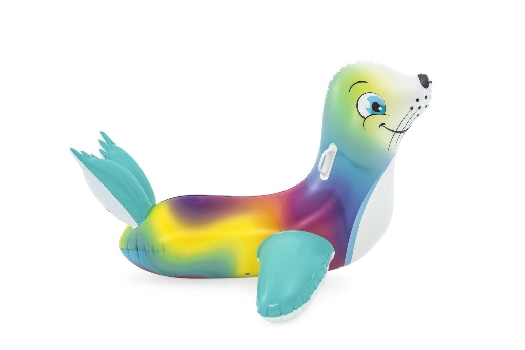 Uživajte v brezskrbnih poletnih trenutkih z barvitim napihljivim tjulnjem, ki je idealen za otroke od 3 let dalje. Dva praktična ročaja zagotavljata zanesljiv oprijem in boljše ravnotežje, medtem ko gladka, trpežna površina nudi udobje pri igri in počitku na vodi.