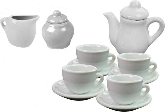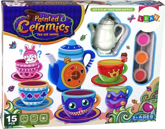 Set vsebuje vse potrebno za okrasitev porcelanske čajne posode - od čajnika do skodelic in krožnikov. Otroci lahko posodo okrasijo z lastnimi vzorci in slikami, kar jim omogoča, da popolnoma izkoristijo svojo domišljijo. Vsak kos posode tako postane unikaten umetniški izdelek.