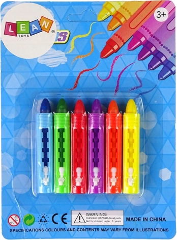 Vsaka barvica je zaščitena s plastičnim ovojem, ki preprečuje umazanijo, drsnik pa omogoča uravnavanje dolžine barvice. Primerno za otroke od 3 let.