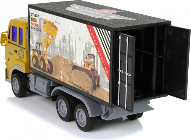 Tovornjak ima rumeno kabino in črn kontejner z izrazitimi nalepkami, ki zvesto posnemajo pravi gradbeni stroj.