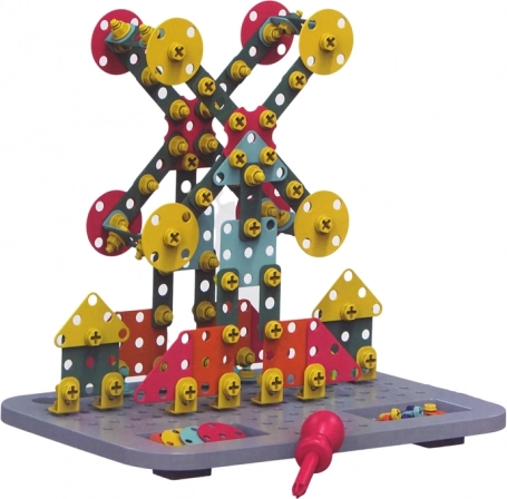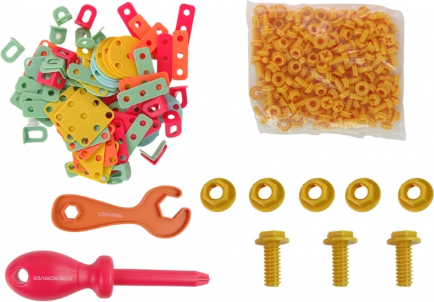Vsebina pakiranja: orodni kovček za sestavljanje, akumulatorski izvijač na baterije, konstrukcijska plošča, ploščati ključ, izvijač, velik komplet matic in vijakov, ploščati deli v oblikah geometrijskih figur.