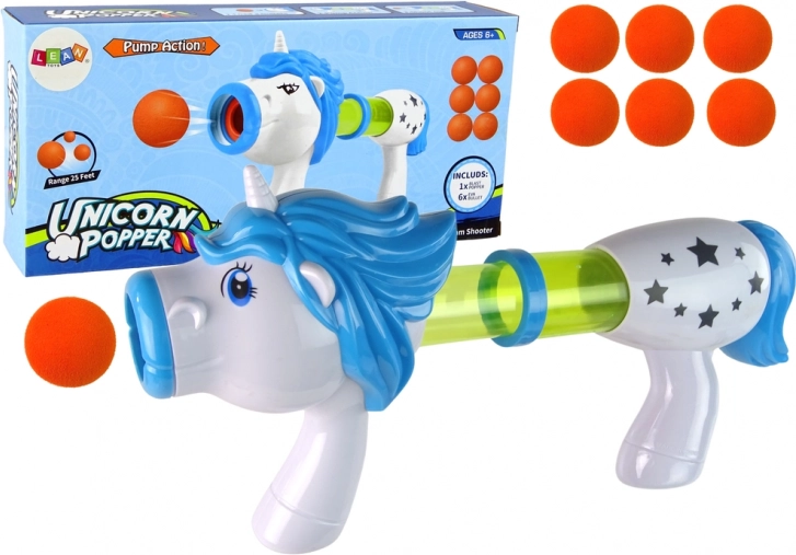 Ljubka pištola v obliki samoroga prinaša veliko veselja in varne akcijske zabave. Vstavite penasto kroglico v prozoren nabojnik in z gibanjem naprej–nazaj napolnite zrak – kroglica nato poleti iz gobčka samoroga. Mehki penasti naboji so nežni in primerni za otroško igro.