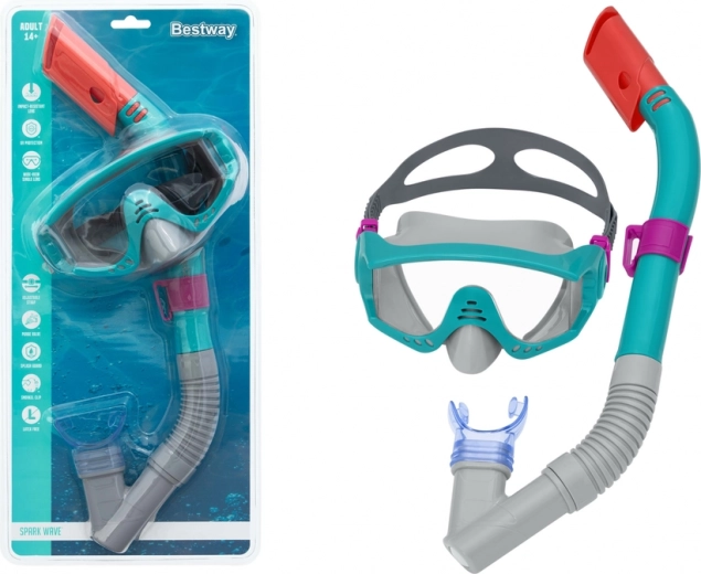 Komplet za snorkljanje BESTWAY za mladostnike in odrasle od 14 let združuje udobno masko in dihalko za varno raziskovanje pod gladino. Mehko silikonsko tesnilo in nastavljiv pašček zagotavljata odlično prileganje brez zamakanja, trpežno steklo z UV filtrom ščiti oči, dihalko z mehkim ustnikom in zaščito pred vdorom vode pa olajša dihanje. Lahek in barvno privlačen komplet je idealen za počitnice in bazen.