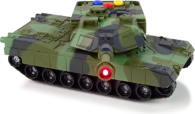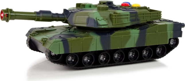 Odkrijte zabaven in vzdržljiv tank za male poveljnike. Zahvaljujoč avtentičnemu maskiranju, gumijastim gosenicam in vrtljivi cevi deluje model prepričljivo in spodbuja kreativno igro. Trije barvni gumbi aktivirajo različne zvoke, rdeča luč v cevi pa simulira strel.