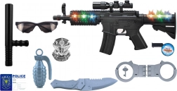 Komplet POLICIJA je nujen dodatek, ki pomaga pri igri policistov in tatov, ki jo otroci po vsem svetu igrajo že leta. Puška, pokajoča bomba, policijski nož, piščalka, značka in lisice dajejo profesionalni videz vsakemu članu policijske enote, temne očala pa dodajo policijski šik, kot v ameriških filmih.