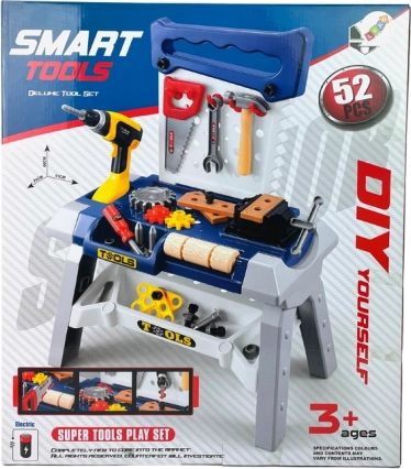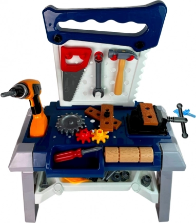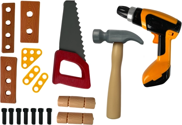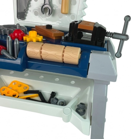V kompletu je širok nabor orodij in dodatkov: imbusni in vijačni ključi, primež, žaga, klešče, kladivo, izvijači, vijaki in matice, zobniki, lesene (plastične) ploščice za vijačenje, stranske škatlice za drobnarije in obešalniki za organizacijo orodja. Delavnica se enostavno sestavi in razstavi ter zavzame minimalno prostora.