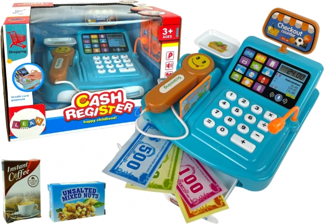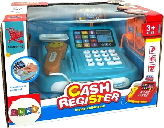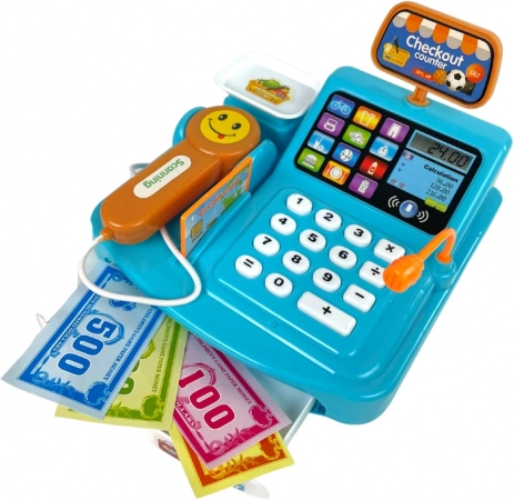 Zabavna otroška blagajna v modri barvi s tehtnico, skenerjem in čitalnikom kartic spremeni vsak dan v realistično trgovinsko igro. Podpira učenje računanja, prepoznavanje denarja in razvoj komunikacije. Skener oddaja realistične zvoke kot v supermarketu, komplet pa vključuje tudi kovance in škatlico piškotov za še pristnejšo izkušnjo.