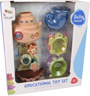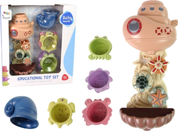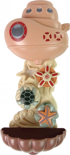 Velika ladja v obliki morskega sveta ustvarja osupljiv vodopad. Pod tokom se vrtijo barvni koluti z vzorci morskih živali. Igrača se zlahka pritrdi na kad s pomočjo priseskov na zadnji strani.