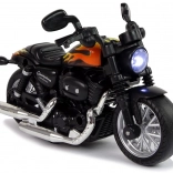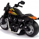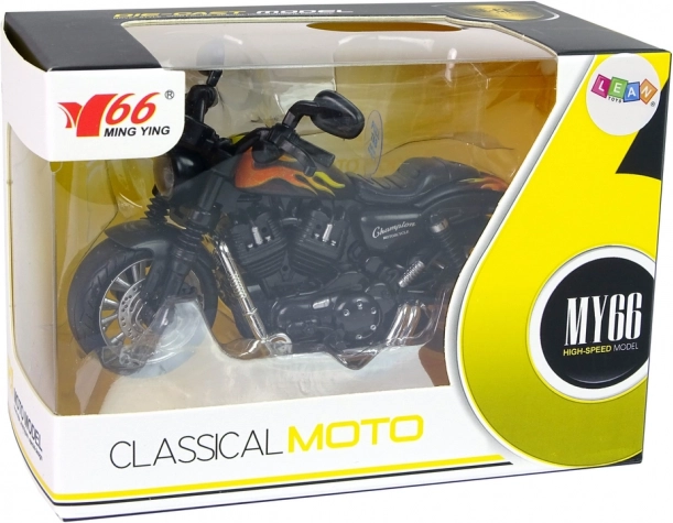 Črno telo motorja z oranžnimi plameni in podrobnimi elementi nudi avtentičen videz pravega motornega kolesa.