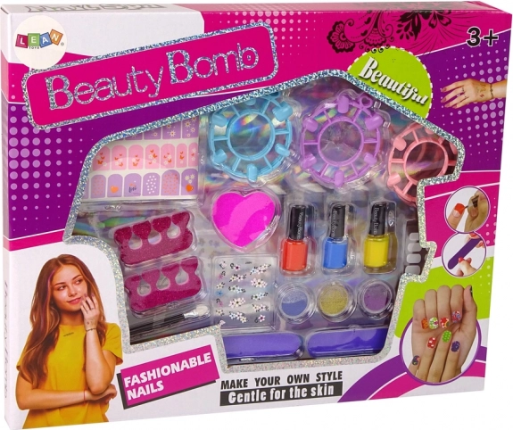 Predstavljamo vsestranski komplet za okraševanje nohtov, ki vsebuje pisane lake za nohte, različne vzorčaste nalepke, posute bleščice in druge kreativne dodatke. Set je zasnovan tako, da spodbuja kreativnost in fino motoriko otrok, medtem ko ustvarjajo svoj edinstven slog.