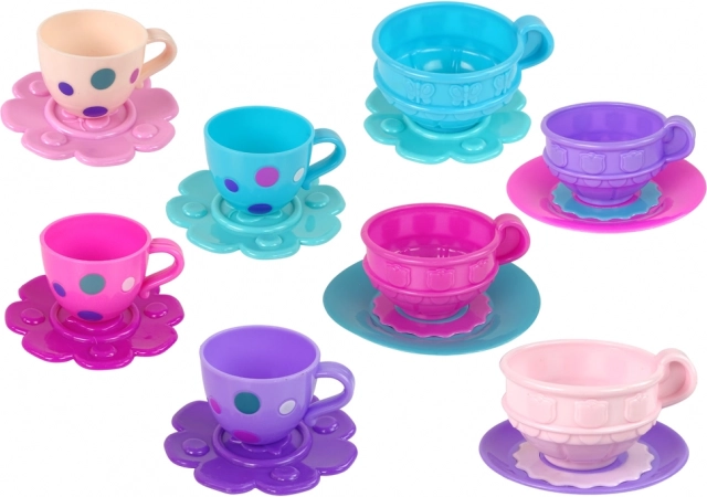 Set vsebuje: 4 barvite lončke, 4 krožničke, 4 čajne žličke, 4 vilice, 4 žlice, 4 skledice, konvičko, posodico za sladkor in čajnik.