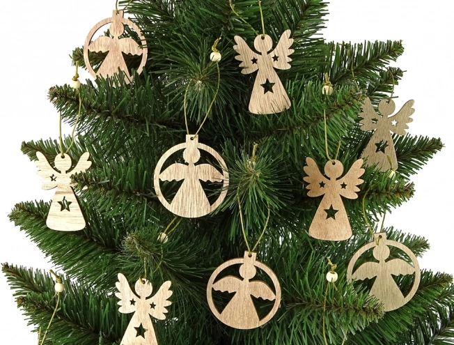 Elegantni komplet 12 lesenih angelčkov za okrasitev božičnega drevesa. Naraven videz, fina izdelava in vrvica za obešanje bodo razveselili ljubitelje tradicionalnih božičev. Okraski so lahki in trpežni, primerni tudi za gospodinjstva z otroki (od 3 let dalje).