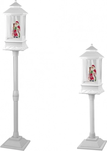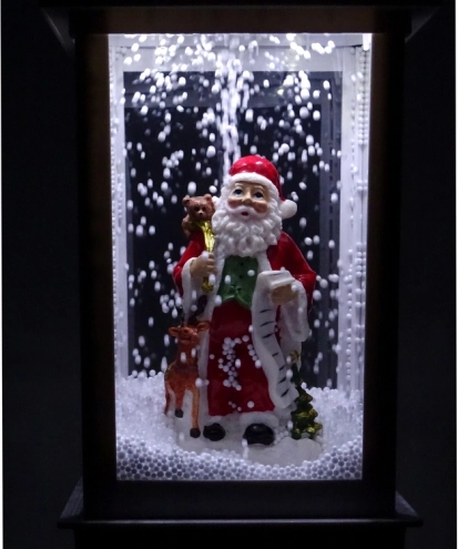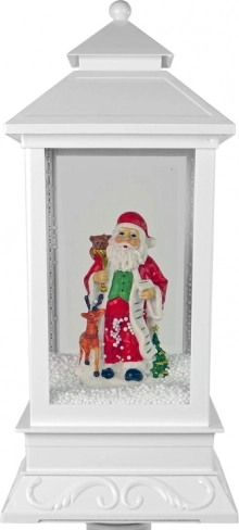 Ta elegantna bela laterna je kot ustvarjena za božično okrasitev. V notranjosti stoji veseli BOŽIČEK z vrečo daril in dolgim seznamom želja. Vgrajena črpalka kroži sneg od podstavka navzgor, tako da znotraj neprestano »sneži«, kar ustvari očarljiv zimski prizor. Trpežna plastična izdelava zagotavlja majhno težo in odpornost – dekoracijo lahko tako uporabljate vsaka božična sezona znova.