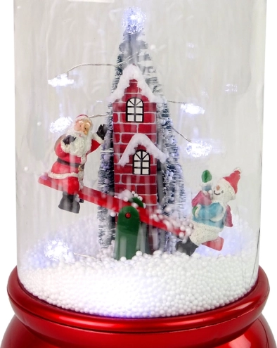 Ta božična dekoracija združuje lepoto tradicionalne snežne krogle z modernimi funkcijami. Integrirana črpalka zavrti umetni sneg, ki pada od zgoraj in ustvari realističen učinek zimske nevihte. V notranjosti najdete veselega Božička s snežakom na gugalnici ter visok opečnat dimnik z božičnim drevescem – prizor, ki razveseli tako otroke kot odrasle.