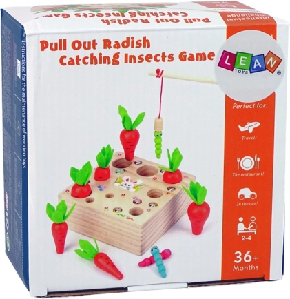 V paketu najdete leseno osnovo z odprtinami, 6 korenčkov, 6 črvičkov in magnetno ribiško palico. Vsak korenček ima svojo velikost in sodi v ustrezno odprtino, kar podpira razvrščanje in fino motoriko. Magnet na koncu palice omogoča preprosto »uloviti« črvičke – naključno ali po barvi, kar dodaja elemente sodelovanja, koncentracije in zabavne igre na vrtičku.