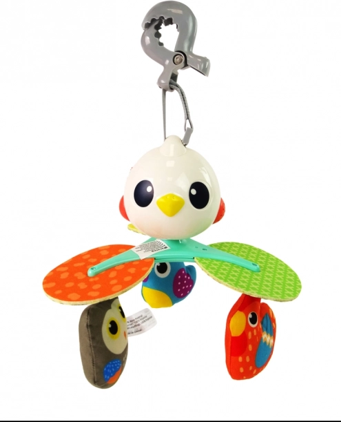 Vrtiljak je izdelan iz odporne plastike in mehkih tekstilnih visečih elementov v živih barvah. Univerzalno pritrjevanje s sponko omogoča hitro montažo na večino okvirjev posteljic in na ročaje vozičkov – idealno doma in na poti.