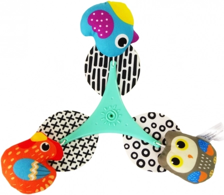Mehki viseči elementi v živih barvah podpirajo vidno zaznavanje in fino motoriko, ko se dojenček steguje proti njim.