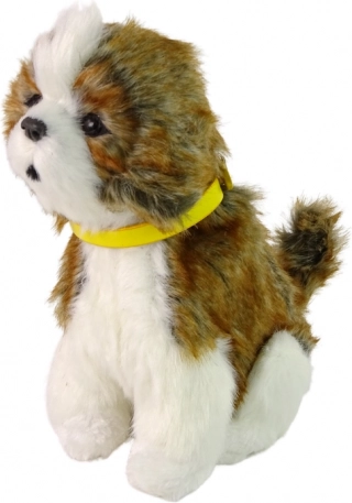 Plišasto izvedbo v belo-rjavi barvi je izjemno prijetna na dotik, medtem ko rumena odstranljiva ovratnica doda kužku na privlačnosti. Temno oči z rjavim robom dajejo realističen videz.