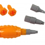 Set vključuje izvijač z udobnim oprijemom in zamenljivimi nastavki, ki ponujajo realistično izkušnjo montaže.