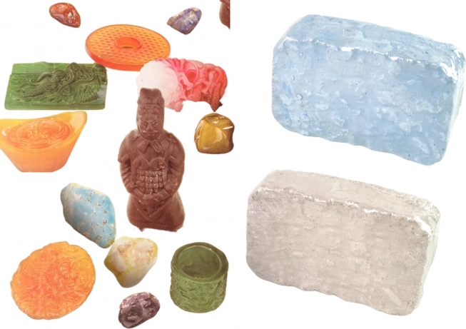 - 2 mavčna kamna, plastična zaščitna očala, dleto, kladivce, čopič, razpršilo, kristali/kamenje, amuleti in figurice