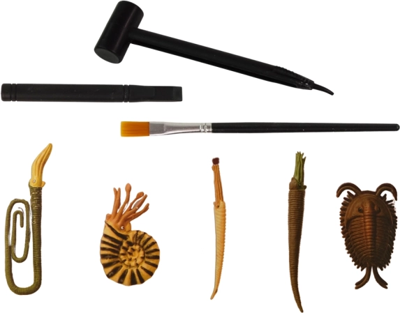 - 1 starodavno bitje (naključna vrsta), dleto, čopič, kladivce, mavec, gobica v obliki dinozavra