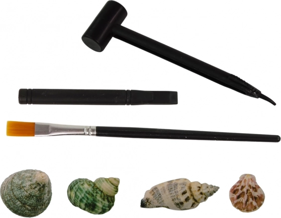 Del pakiranja so varna orodja za male arheologe: dleto, kladivce in čopič. Otroci vadijo natančnost, potrpežljivost in ročne spretnosti ter si lahko postopoma ustvarijo lastno zbirko školjk. Na embalaži najdete podobe možnih modelov (npr. pokrovača, zeleni polž, turridae, polž s črnimi usti, polž z rdečim obarvanjem), zato je prepoznavanje enostavno.