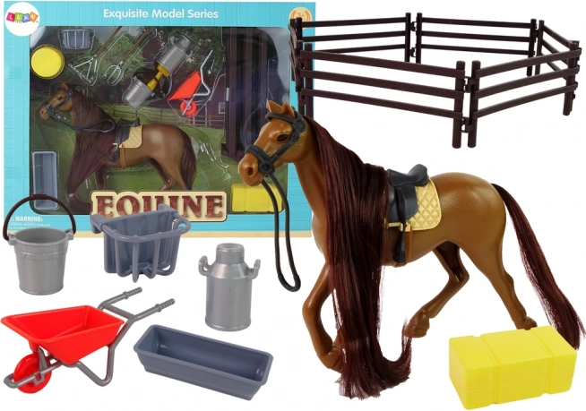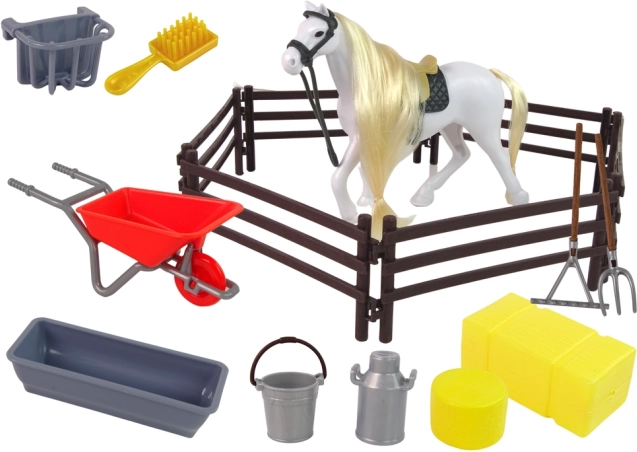 Ta čarobna figurica konja z dolgo grivo je idealna za česanje in izdelovanje kitk. Set vključuje tudi dodatke, potrebne za vsakodnevno življenje v hlevu - kot so samokolnice, grablje, vile ali vedra za vodo in hrano. Otroci se lahko veselijo ur zabave, medtem ko skrbijo za svojega novega živalskega prijatelja in razvijajo svojo domišljijo in ročne spretnosti.
