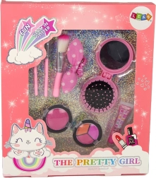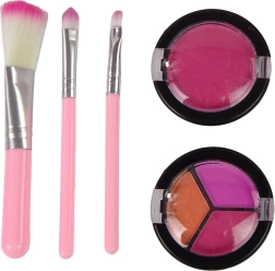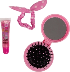 - Vsebina seta: zložljiva krtača z ogledalcem, elastika za lase z mašnico, 3× čopič, lip gloss, rdečilo za lica, senčila za oči