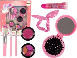 - Krtača z ogledalcem, elastika z mašnico, 3× čopič, lip gloss, rdečilo za lica, senčila za oči