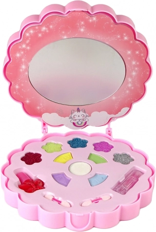 Otroška paletka v obliki cveta z ogledalcem vključuje pisane senčila za oči in bleščice – idealno za prve varne poskuse ličenja in domišljijsko igro.