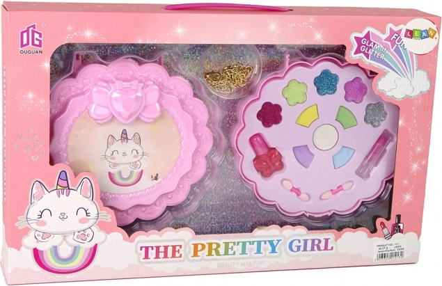 Šminka, lak za nohte, senčila, bleščice, aplikatorji in zlat ogrlica – vse, kar je potrebno za varno in ustvarjalno igro od 3. leta dalje.