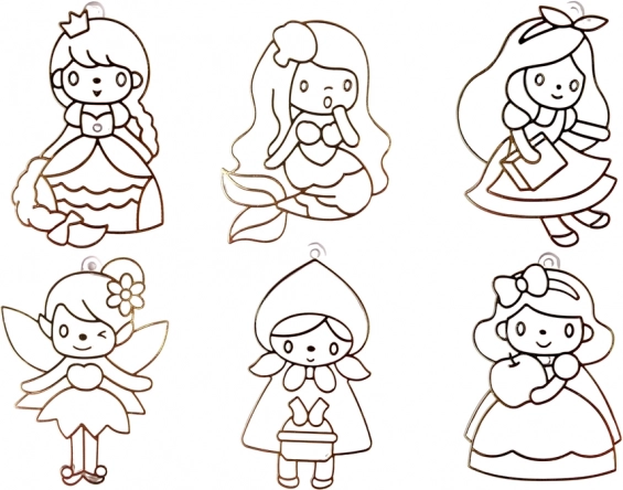 Šest prozornih motivov princes, pripravljenih za barvanje, spremeni vsak popoldan v ustvarjalno delavnico in polepša okna ali nahrbtnike z izvirnimi obeski.