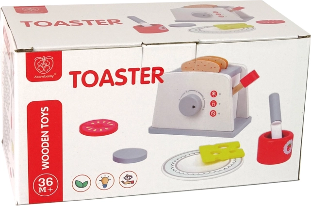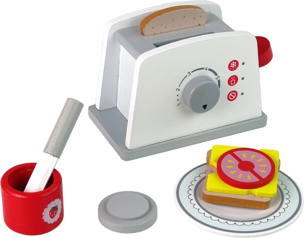 V paketu so poleg toasterja tudi rezine kruha, nožek, kozarček marmelade, rezina sira in rezina paradižnika za pripravo najboljših sendvičev. Lesena obdelava je trpežna, prijetna na otip in prijazna do otroških rok.