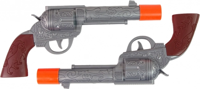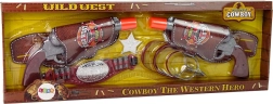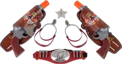 Ta popolna kavbojska oprema vsakega otroka spremeni v pogumnega varuha reda. Ob pritisku na sprožilec revolver odda realističen zvok strela (napajanje AG13), medtem ko pas s tokovi drži pištoli vedno pri roki. Varne oranžne konice in kakovostna plastika zagotavljajo brezskrbno igro doma in na prostem.
