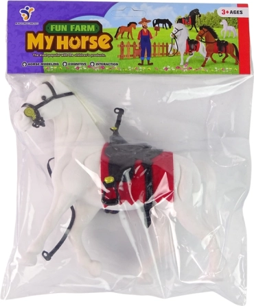 Realistična figurica belega konja s črnim sedlom in rdečo podsedelnico za male ljubitelje hlevov in kmetij. Izdelana iz kakovostnega, na otip prijetnega materiala, z dolgo grivo in repom, idealnima za česanje in pletenje. Odličen dodatek k otroški zbirki figuric in za kreativno igro od 3 let naprej.