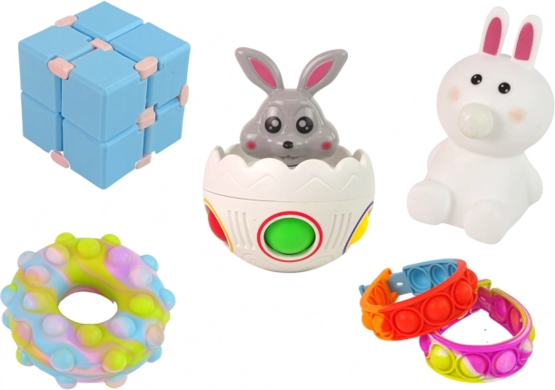 Pop it krof, zapestnice, zajček in jajčko, stiskalne figurice ter fidget kocka – popolno za senzorično igro in sproščanje stresa.