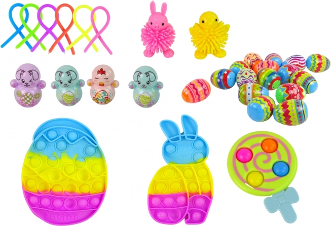 Ta velikonočna kolekcija združuje zabavo in razvoj veščin. Otroci lahko stiskajo, pritiskajo, razpenjajo in raztegujejo različne igrače, ki pomagajo sprostiti napetost in izboljšajo koncentracijo. Komplet je idealen za praznične dni, vrtce, zabave in domače ustvarjanje.