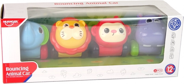 - 4 avtomobilčki v obliki živalic (slon, hipopotam, lev, opička)
