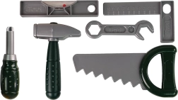 Komplet vsebuje vse potrebne orodje za male mojstre, vključno s kladivom, izvijačem in žago.