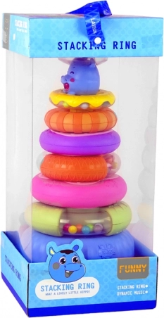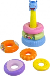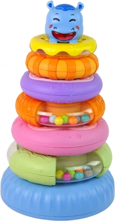 Izobraževalna piramida je sestavljena iz šestih barvnih obročkov, ki jih lahko zlagate enega na drugega v različnem vrstnem redu in tako ustvarite piramido. Na vrhu piramide je prikupen, nasmejan povodni konj. Vsak obroček ima drugačno velikost in barvo, kar pomaga otrokom pri učenju razlikovanja barv, velikosti in oblik ter hkrati vadijo koordinacijo. Na ta način igra razvija tudi kognitivne sposobnosti in logično razmišljanje, kar je ključno za pravilen razvoj vašega otroka!
