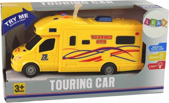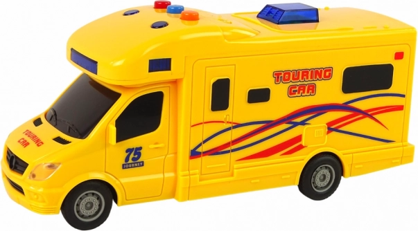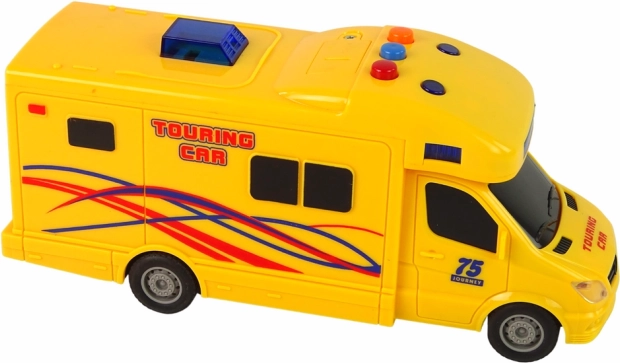 Rumeni avtodom za otroke prinaša vsakdanji odmerek počitniške zabave. Zahvaljujoč frikcijskemu pogonu ga le pritisnete, povlečete nazaj in spustite – vozilo steče naprej. Za še bolj realistično doživetje poskrbijo svetlobni učinki z modrimi LED diodami ter zvočni učinki zagona, vožnje in vzvratne vožnje. Robusten izdelek, gumijaste pnevmatike in kompaktne mere ga delajo idealno igračo za doma in na poti.