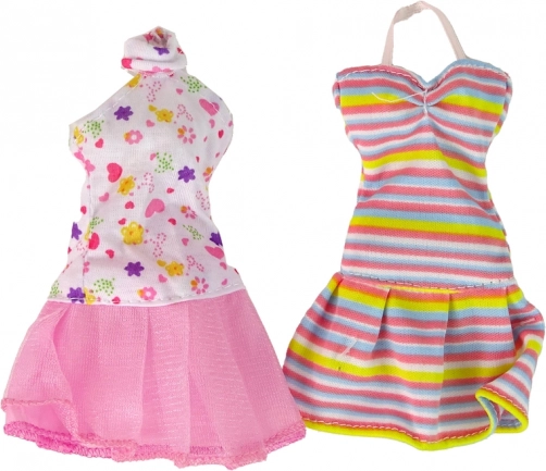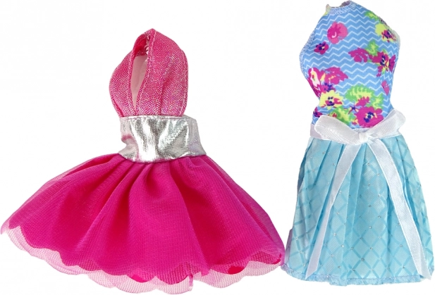Del kompleta so 4 zamenljive obleke (paskasta, večerna rožnata z bleščicami, modra s cvetličnim vzorcem in pentljo, nežna rožnato-bela s cvetovi in srčki), dve torbici, klobuk in nadomestni čevlji. Vse je pregledno shranjeno v darilni embalaži z okencem, ki očara na prvi pogled.