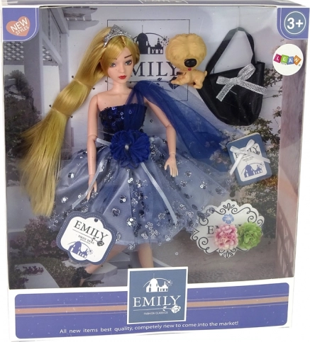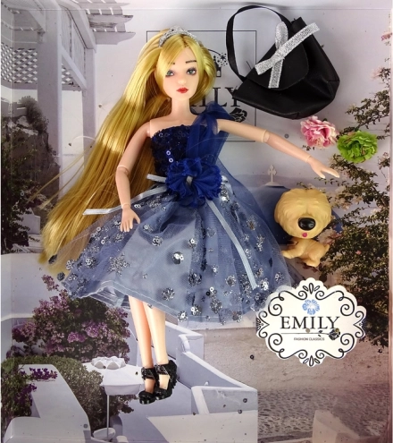 Odkrijte elegantni čar punčke Emily – njeni dolgi svetlolasi lasje, bleščeča modra obleka s cvetličnimi detajli in modni čevlji jo naredijo za čudovito družabnico pri vsakodnevni igri. Set dopolnjuje prisrčen kužek, črna torbica s srebrno pentljo in dekorativna cvetova za izvirne modne prizore.