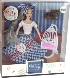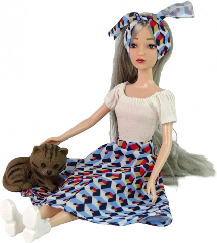 Odkrijte čar punčke EMILY z dolgimi sivimi lasmi, svetlo modrimi očmi in usklajenim naglavnim trakom. Nosí bel top in razširjeno krilo z geometrijskim vzorcem, ki ga dopolnjujejo bele čevlje. Del seta sta prisrčen mucek in bela gugalnica – idealno za domiselne prizore in skrb za ljubljenčka.