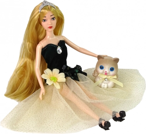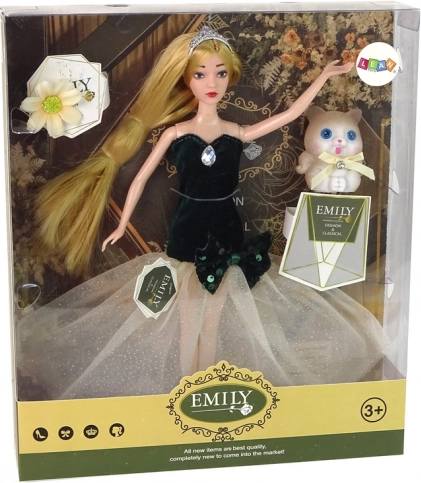 Punčka Emily z dolgimi lasmi, mucko in cvetličnim okrasom