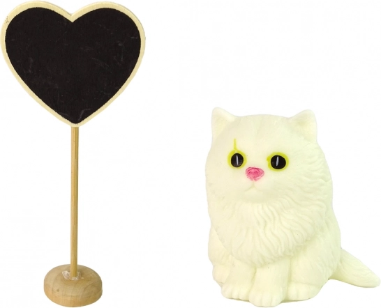 Del seta je bel mucek s piščalko za vesele zvočne učinke in dekorativno leseno srce na stojalu, idealno kot kulisa k “pisti” za igro. Set je odlično darilo za male ljubitelje punčk in mode.