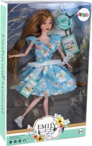 Punčka Emily (30 × 7 × 4 cm) je idealna spremljevalka za vsakodnevno igro. Dolge lase v odtenku temne blond je mogoče enostavno česati in okraševati, zato si lahko otroci ustvarijo nešteto pričesk. Modro obleko s cvetličnim vzorcem krasita čipkast pentljik in droben »diamantni« detajl pri izrezu, ki punčki doda eleganten videz.