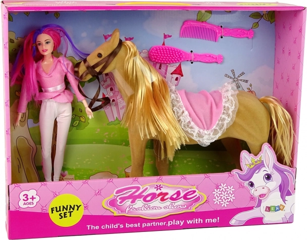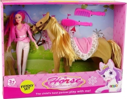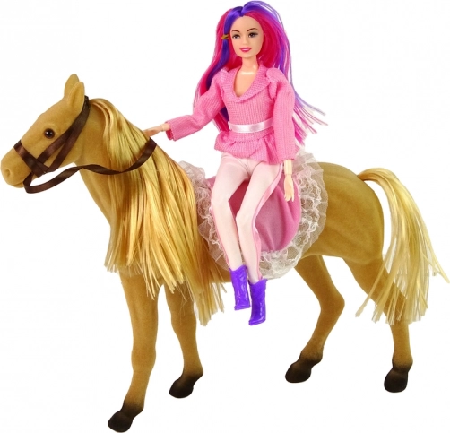 Vstopite v svet domišljije s punčko jezdeko in njenim čudovitim rjavim konjem. Punčka ima gibljive roke in noge, kar omogoča različne položaje, ko stoji ali sedi na konju. Njena stilska oprava je tipično jezdeška, kar igri doda pristnost.
