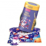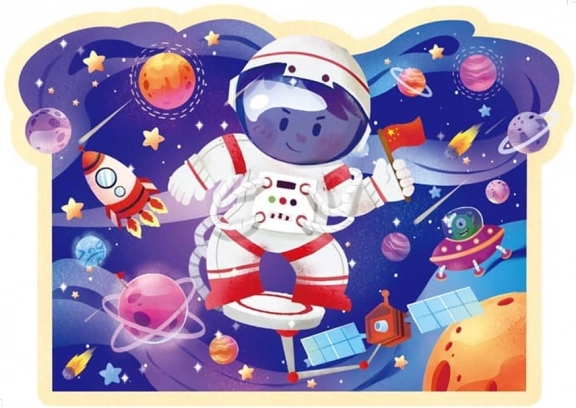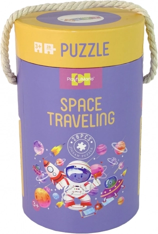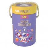 Ilustracije prikazujejo lik malega astronavta v okolju, polnem planetov, raket in satelitov, ki otroka popeljejo v barvito in podrobno vesoljsko pustolovščino. Pakiranje v priročni okrogli tubi omogoča enostavno prenašanje in shranjevanje, idealno za uporabo doma in na poti.